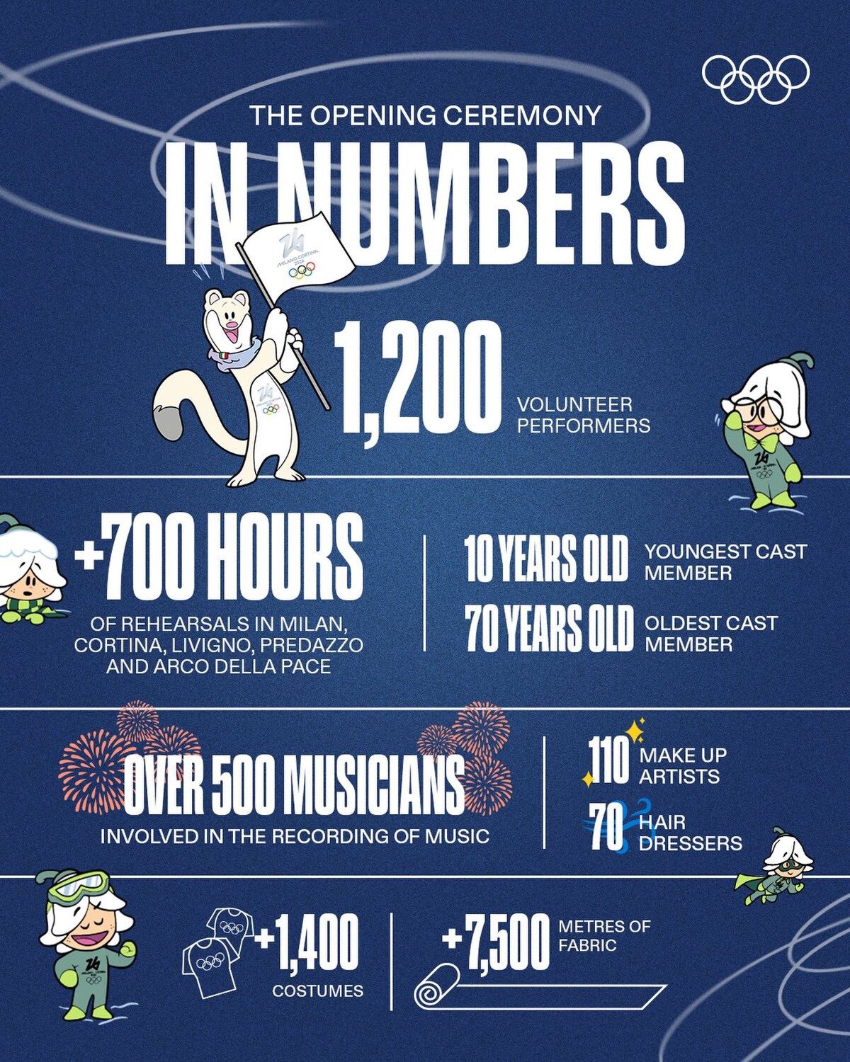 1 200 bénévoles-artistes +700 heures de répétitions à Milan, Cortina, Livigno, Predazzo et Arco della Pace 10 ans – membre le plus jeune de la distribution 70 ans – membre le plus âgé de la distribution Plus de 500 musiciens impliqués dans l’enregistrement de la musique 110 maquilleurs 70 coiffeurs +1 400 costumes +7 500 mètres de tissu